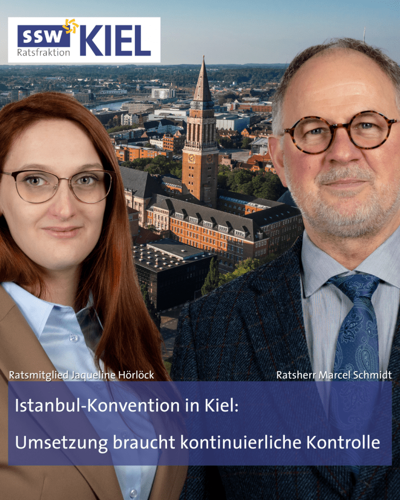 Zum Ergänzungsantrag der SSW-Ratsfraktion zu Drs. 1081/2025 „Istanbul Konvention“, der heute im Ausschuss für Soziales, Wohnen und Gesundheit beraten wird, erklären Ratsmitglied Jaqueline Hörlöck, sozialpolitische Sprecherin der SSW-Ratsfraktion Kiel, und Ratsherr Marcel Schmidt, Vorsitzender der SSW-Ratsfraktion Kiel: